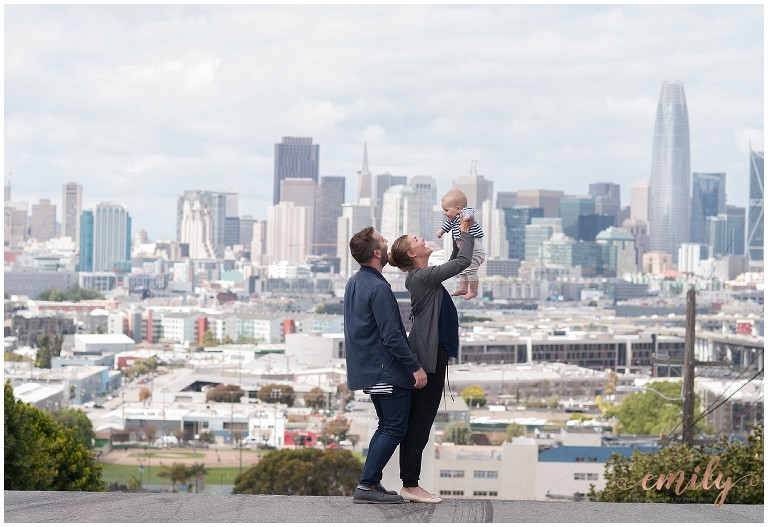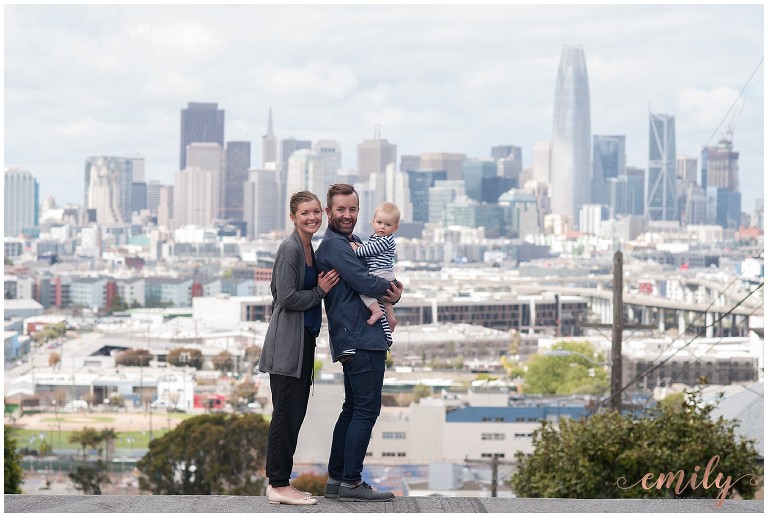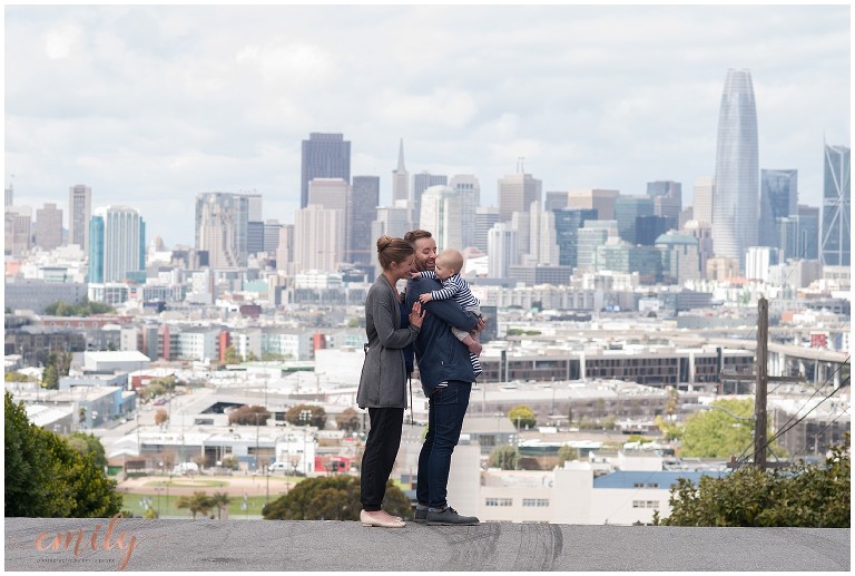 I was referred to this family by a another lovely San Francisco family with a baby about the same age as baby Jack. Dad greeted me at the door and said that Jack was ready but a little shy. I love interacting with the shy ones. I come in very softly and gently. Oh my gosh, when I peeked in and saw Jack, he was sitting up right in the middle of mom and dads bed. Mom was very close and he was in his comfy spot, so he was totally chill. He warmed up and smiled right away! He was in the perfect spot so I started photographing right away. Mom and dad were loving all of the smiles and cute expressions Jack was giving us! Dad saw one of the photos on the back of the camera and was blown away! We moved from their adorable apartment to my favorite view of San Francisco from Potrero Hill.