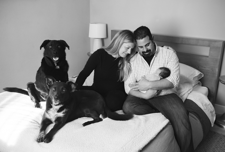 I set up a little studio in their bedroom. I used their beautiful light wood floor as a background for many of the photos. Sofia was a dream. Also, she may have been dreamING the whole time! Sleepy little girl let us pose her in all of the adorable newborn poses that mom was hoping for. We even incorporated their fur babies in the family photos. Mom and dad run a doggie day car in San Francisco so it was important to capture the pups as well!